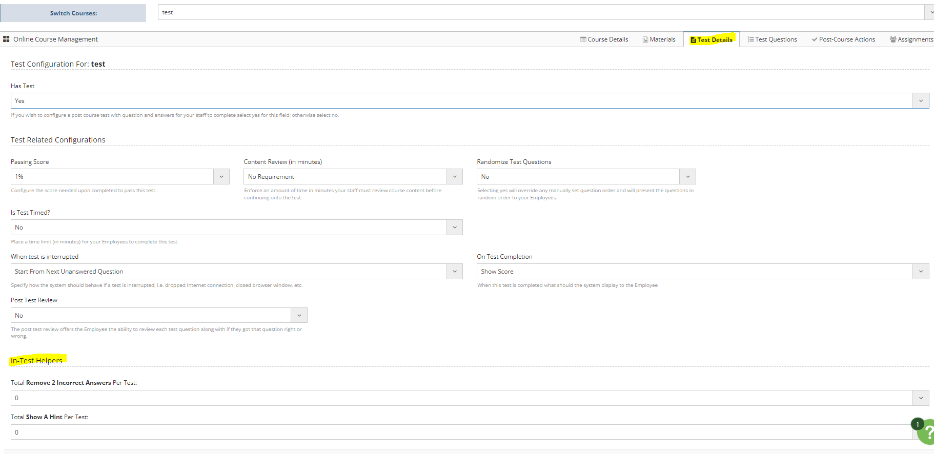Not every course you create has to have a test. You can easily create a course with strictly material for your staff to review. If you do associate a test with your course you can configure the details from the 'Test Details' tab.