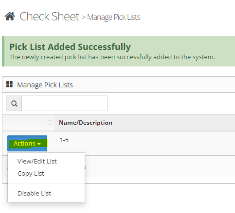 Step 2: Select 'View/Edit' from the actions button next to the pick list to make changes. Select 'Copy' to copy the list and 'Disable' to disable the list.