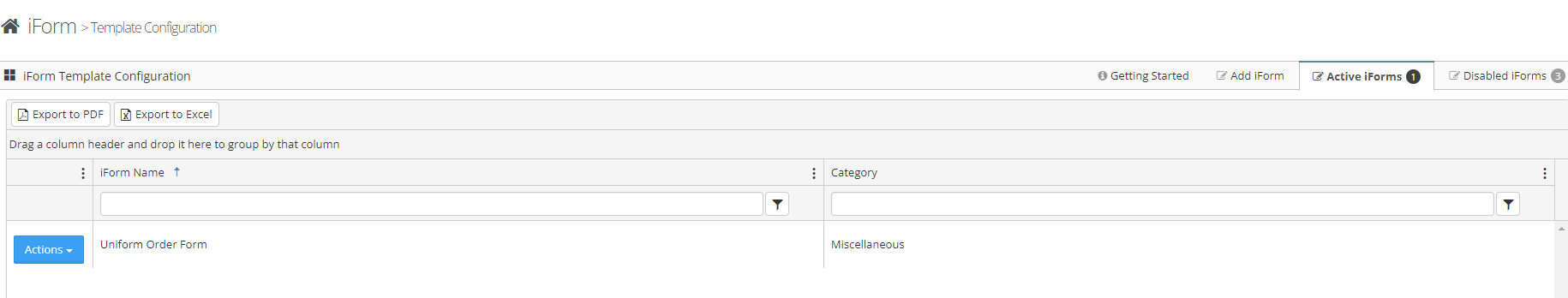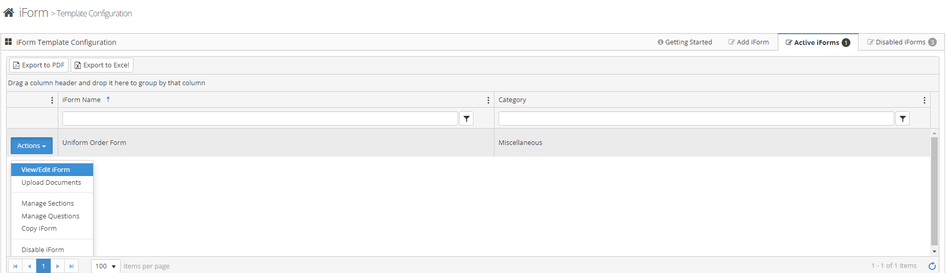 Step 6: Select 'View/Edit iForm' from the actions button to make changes to the template, select 'Upload Documents' to upload an associated document that is viewable by employees when they submit the iForm