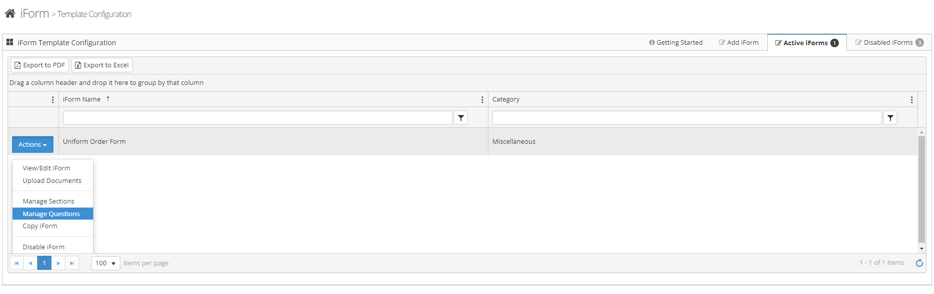 Step 6: From the Actions Button next to the template select Manage Questions