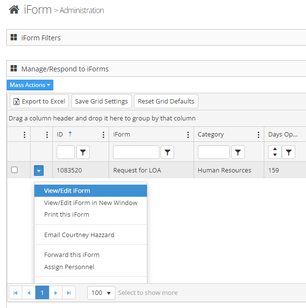 Step 2: Locate the iForm you want to interact with (Step 1&2 can be found in the Accessing/Searching Submitted iForms article)