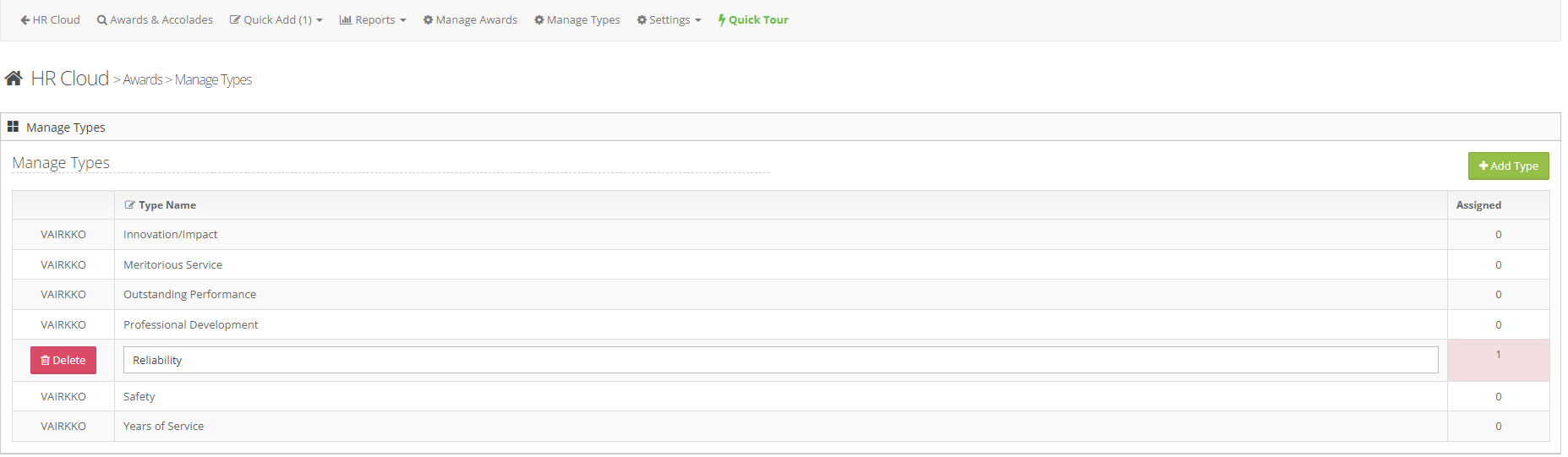 Step 6: Click the 'Add Type' button to create a new award type.