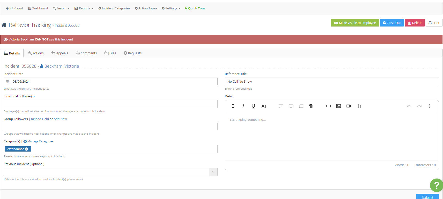 Step 2: From this area, you can make the incident visible to the employee, close it out, delete the incident, and print the incident.