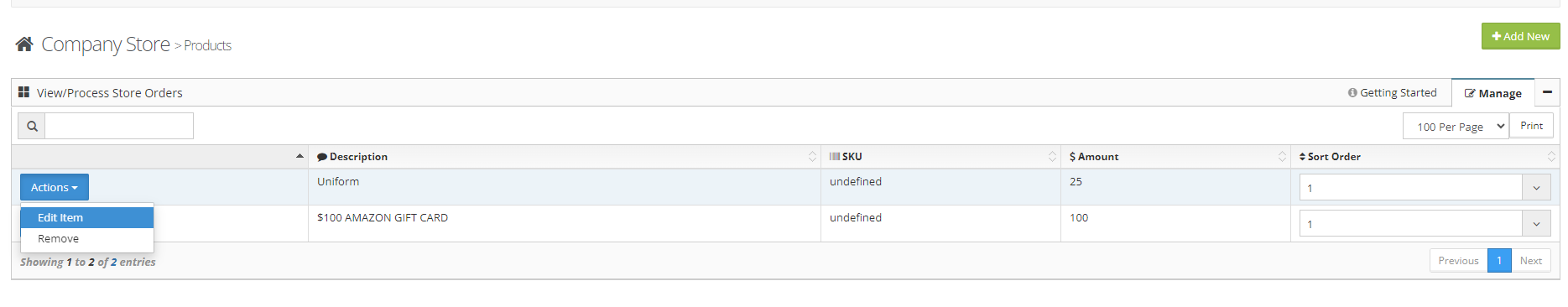 Step 1: From the Products, area select either View/Edit Item or Remove Item from the actions button next to the product. The Product sort order can also be adjusted from this page.