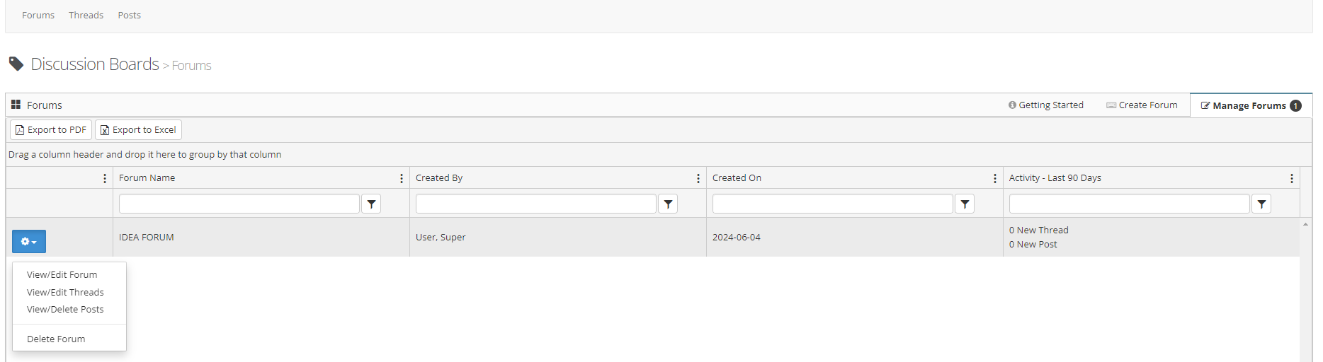 Step 2: From the gear button next to the forum you can View/Edit the Forum, View/Edit any Threads or Post within the forum or delete the forum