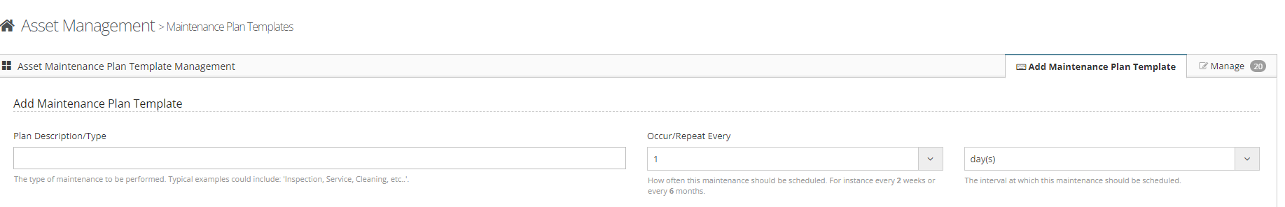 Step 6: Select the 'Add Maintenance Plan Template' to enter a new plan or the 'Manage' tab to update a plan