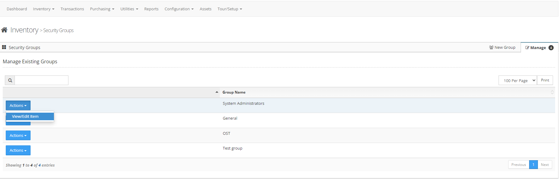 Step 6: From the actions button next to the configured security group select 'View/Edit' to make changes to that group