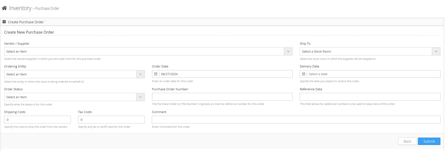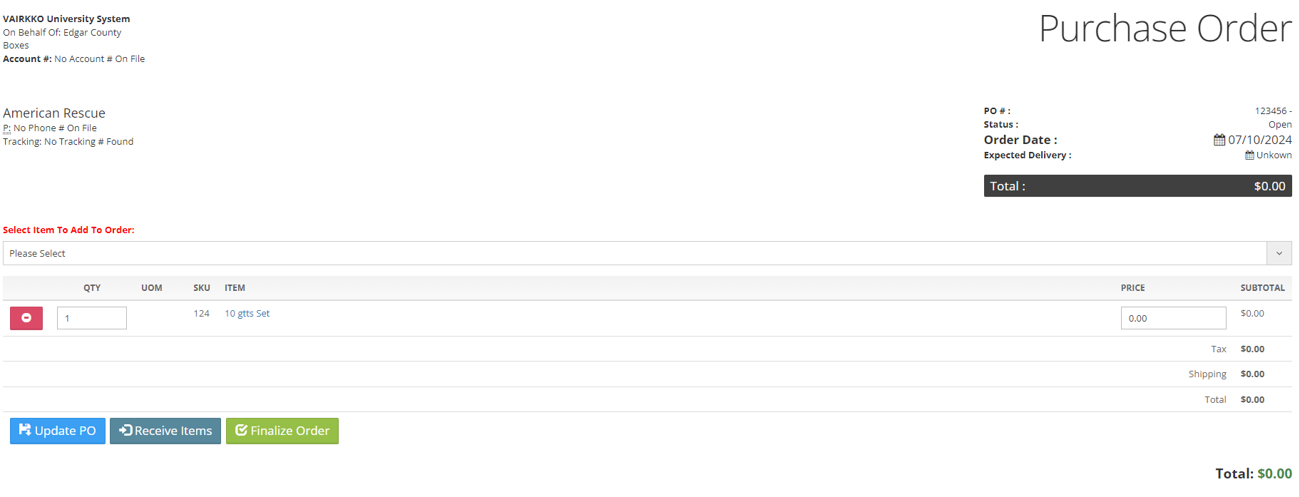 Step 6: Enter the item you want to add to the order. If the item has a vendor price associated with it will be added to the PO, or you can manually enter a value