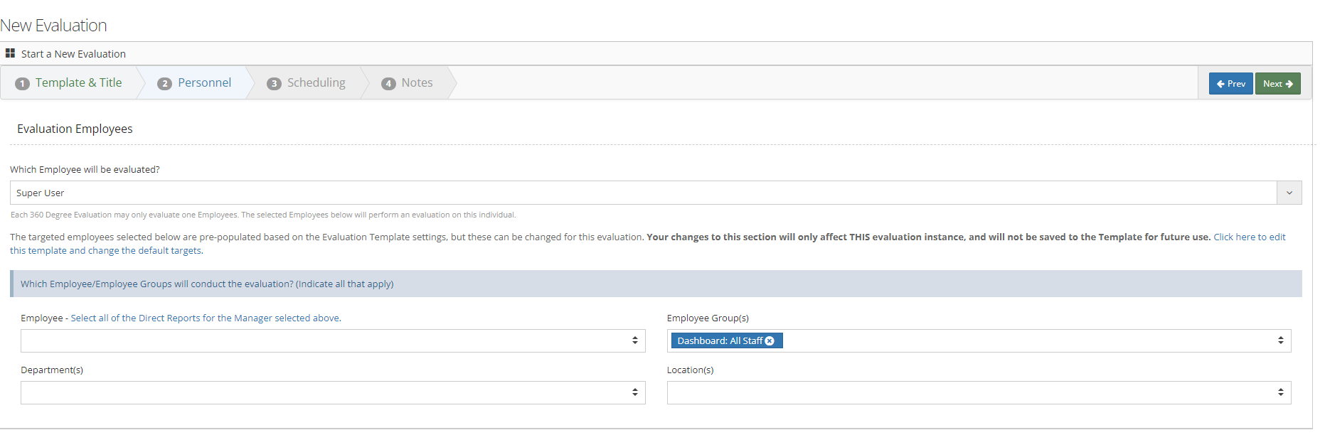 The New Evaluation feature allows you to select the appropriate Evaluation Template to begin a Performance Review for an employee, an employee group, or the entire organization. You’ll add open and close dates here as well as helpful notes for participants to read about that Evaluation. Follow the steps below to perform a new evaluation.