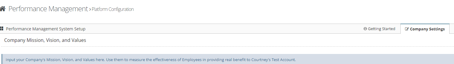 Company Settings allow you to input your organization's Mission, Vision, and Values so that this information can be included in communication to your employees regarding the Performance Management processes and procedures. This company information can be integrated into your evaluation and the customizable email template.