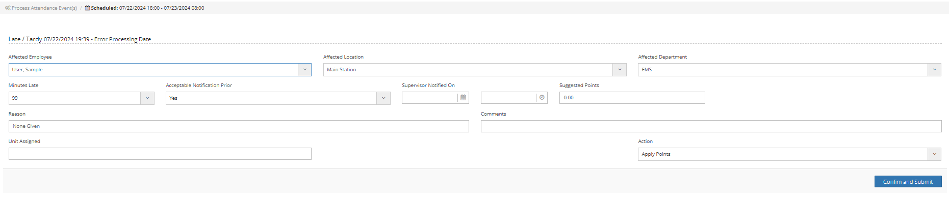 The process event feature allows you to add and track attendance events easier. When you utilize the process feature the location, department, and the time span is prepopulated.