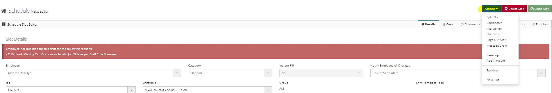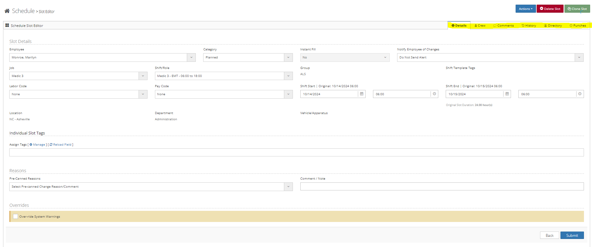 - Details - On this tab, you can make changes to the slot details like work hours, the employee, add Tags and staff role