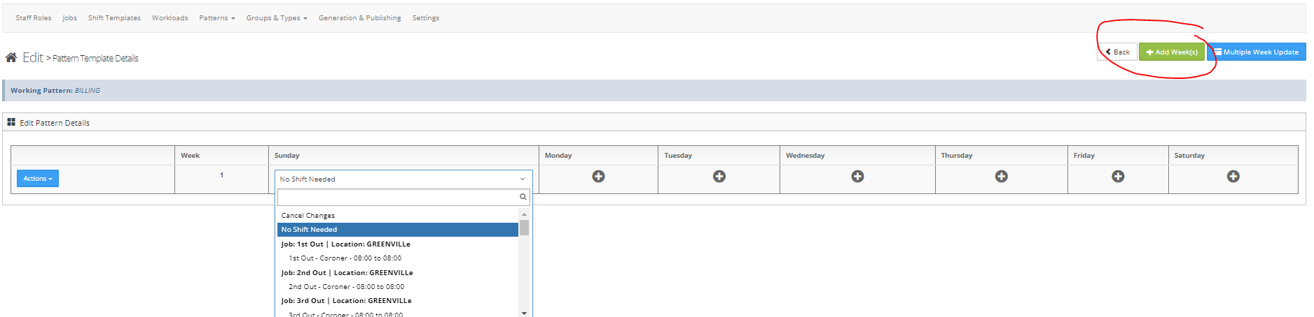 Step 2: To insert another week either select 'Insert Blank Week After' from the actions button or select the 'Add Week(s)' button