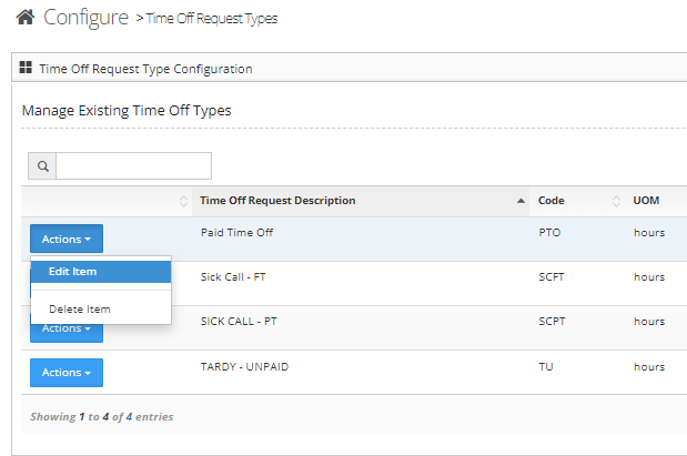 Step 2: Select either "Edit' to make changes to the time off type or Delete' to remove the time off type from the actions button next to the time off type