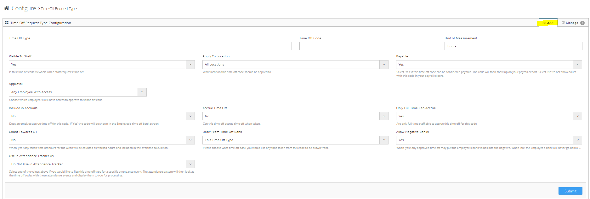 To create or manage your time off types continue reading below.