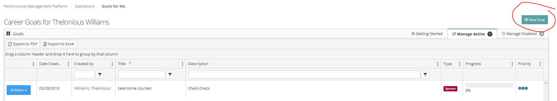 Step 6: From the Manage Active tab you can easily view/edit or disable the goal from the actions button next to the goal