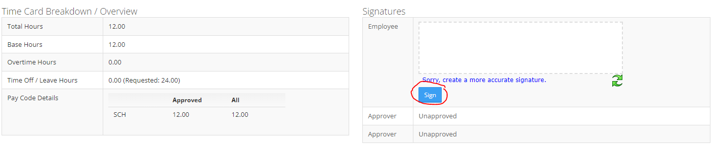 Step 6: After you have approved all your shifts you will be able to sign the time card at the bottom