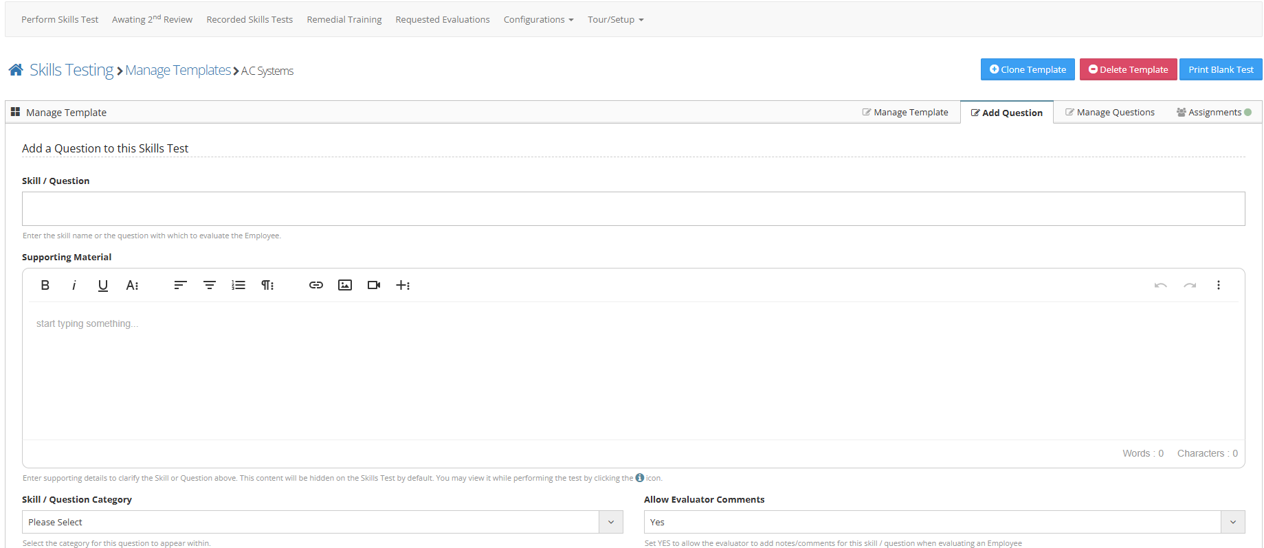 Step 3: Enter your question in the Skill/Question area. The supporting material area allows you to enter any directions or material for the question. The Category of the question and if the evaluator can enter comments.