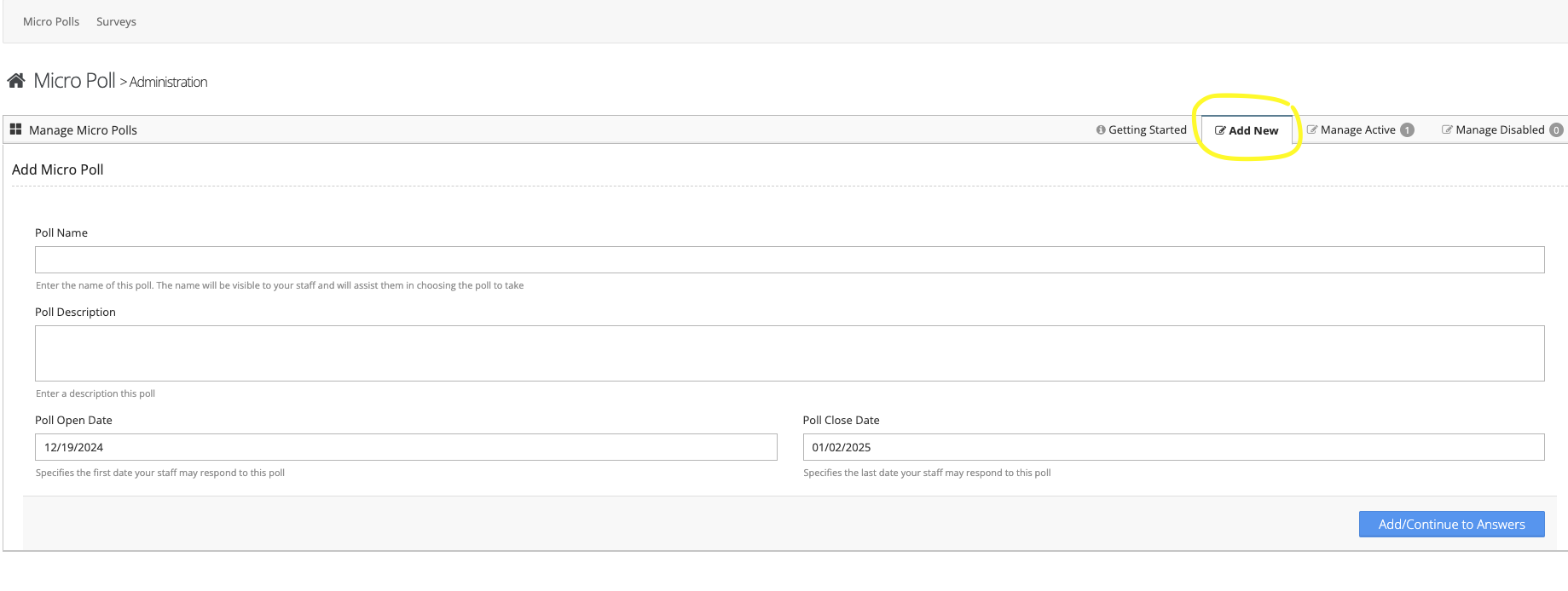 The Polls title and description are used to specify what question you are asking. For example, the Polls title could be 'Holiday Off' the description could ask the employee to select the holiday they want off. The polls answers would be those holidays.