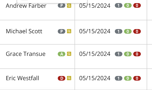 Requests that have a replacing employee will have the user's name in the replacing column. The signifiers are P for pending, A for approved, and D for Denied which reflect the current status of the replacing employee. The spyglass icon will display a 1-month view of that user’s schedule.
