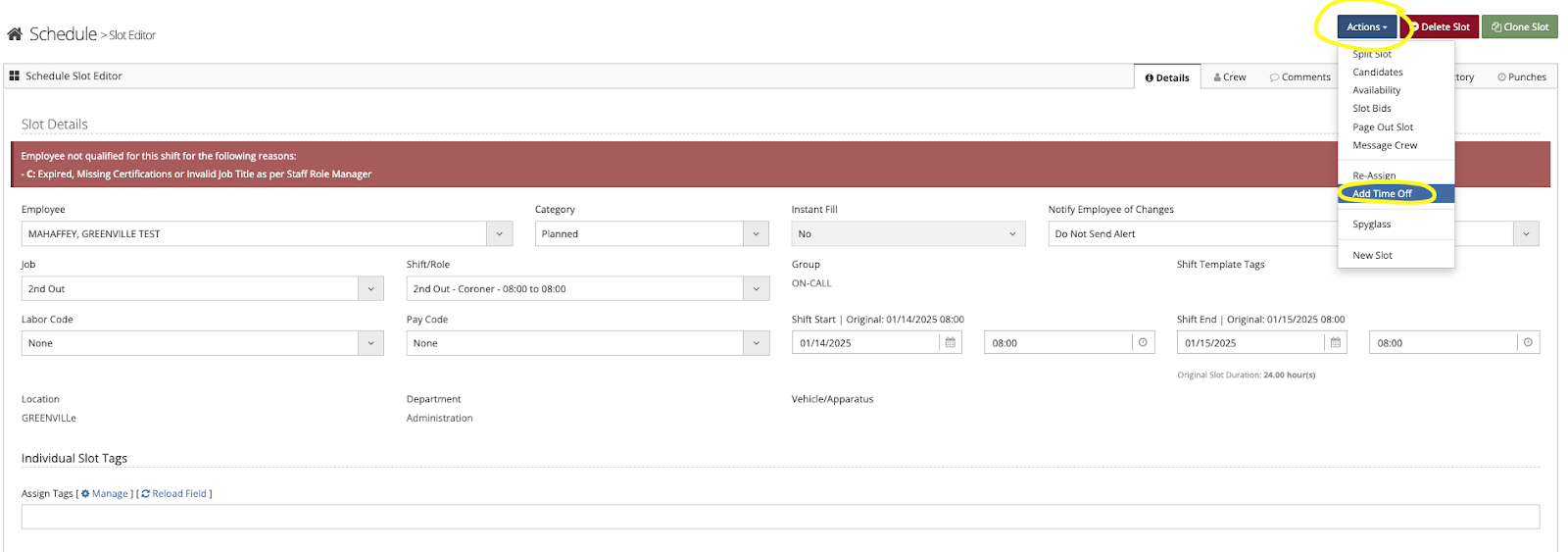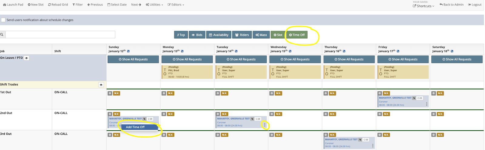 Adding time off for users can be accomplished from several areas in the system. From the time-off area as shown in the previous step, from any grid editor, from time cards, and the ‘Actions’ button within a slot.