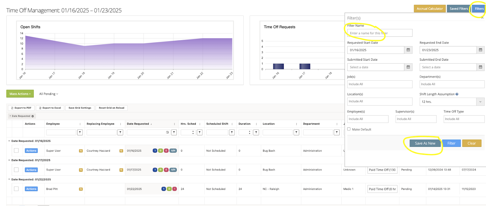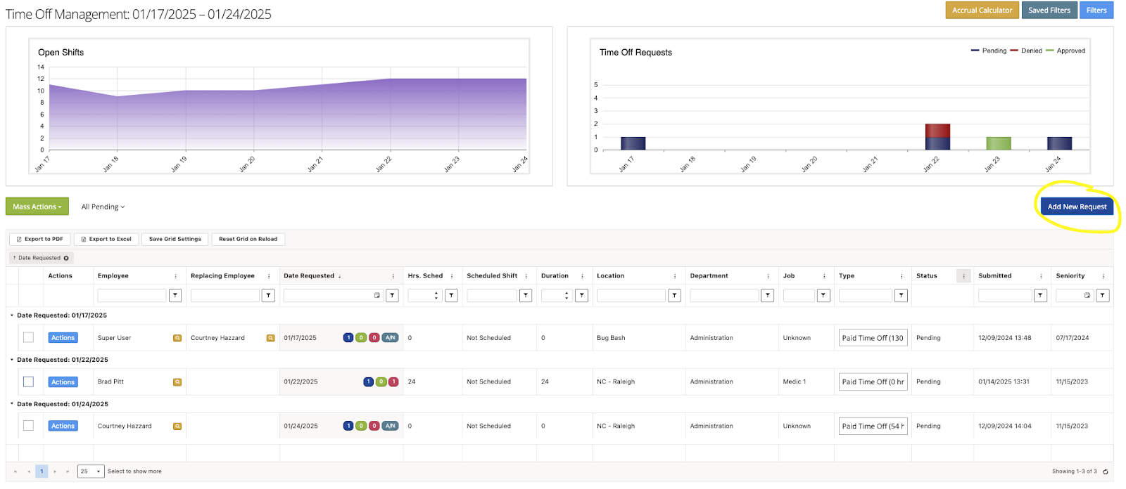 Step 6. To add time off for a user from this screen, click on ‘Add New Request’. Follow the prompts in the pop-up by selecting the user, date range, and whether to apply the time off to scheduled or all days within the time span.