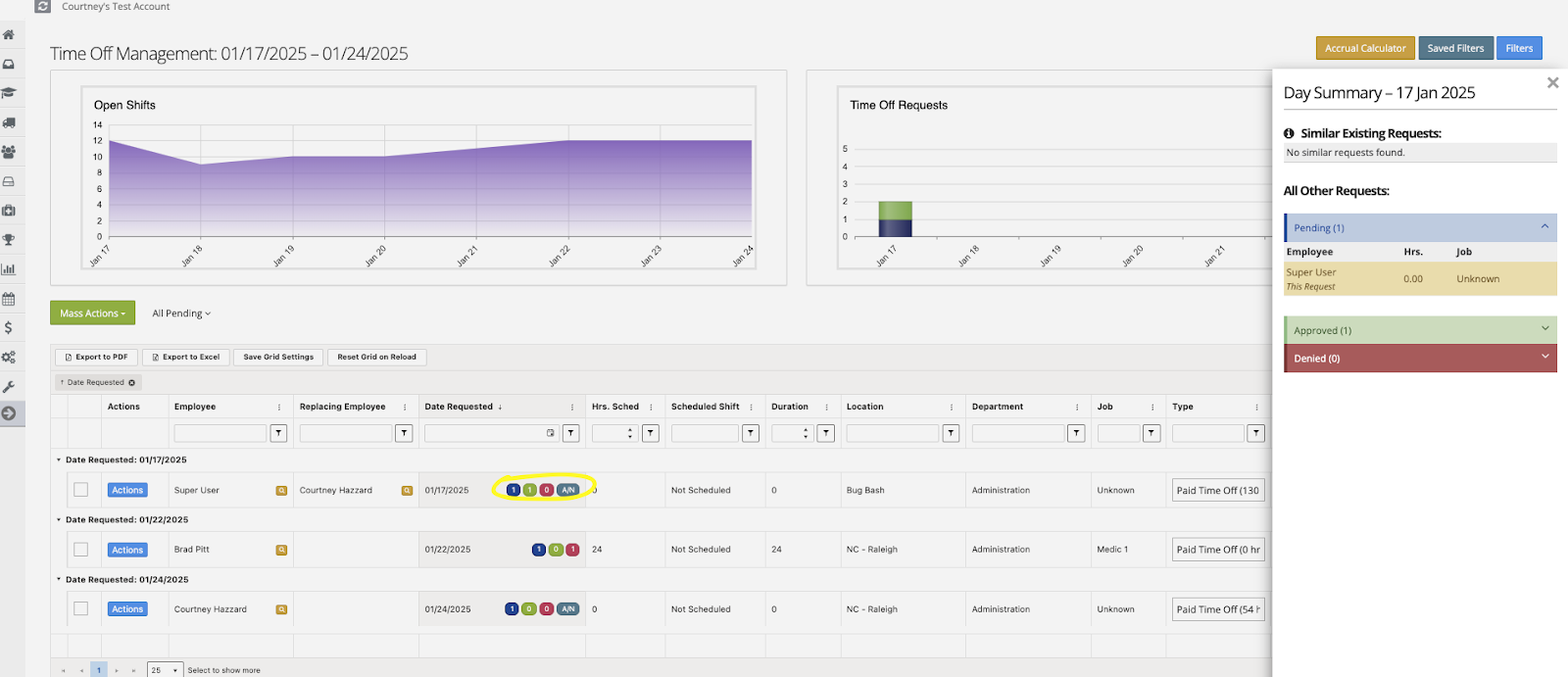 To see time off details for a requested day, click on one of the color dots in the ‘Date Requested’ column. A pop-up window will appear on the right-hand side of the screen.