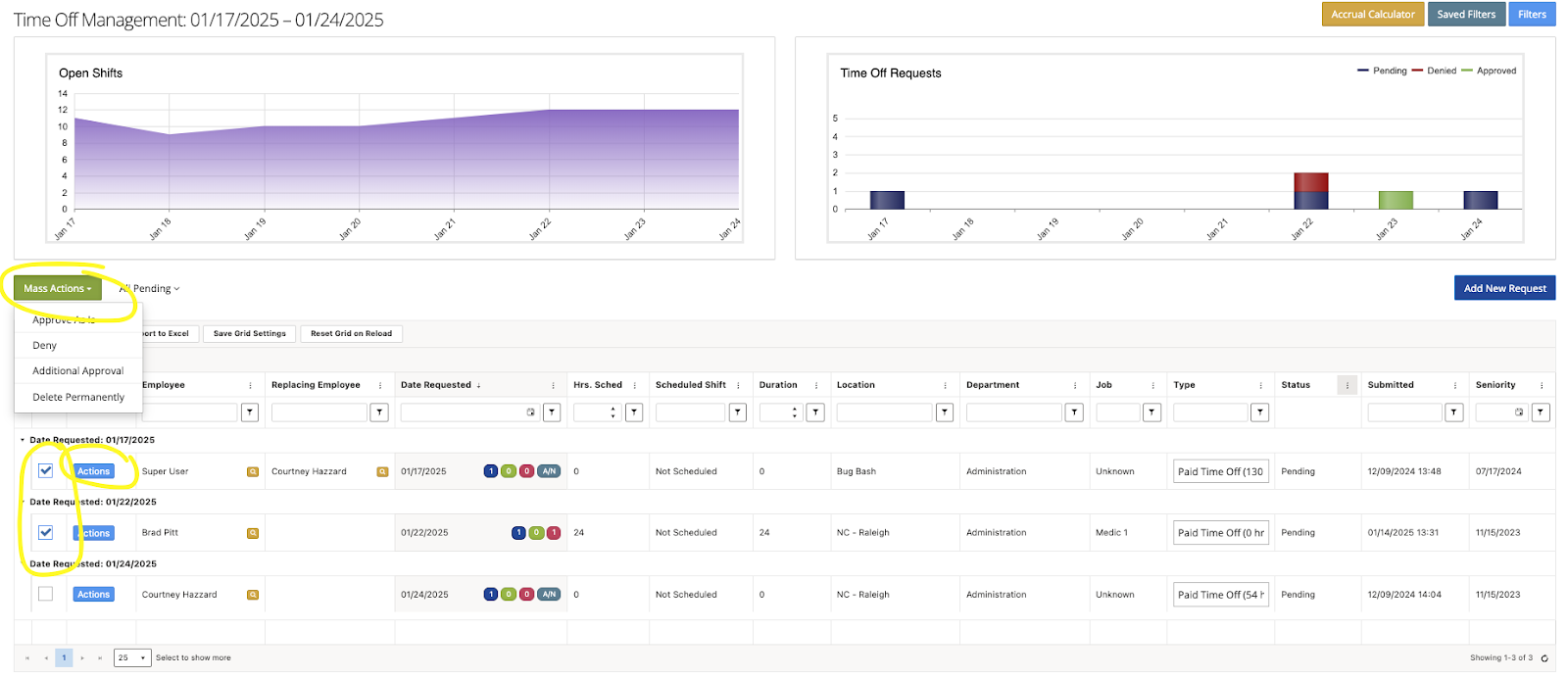 Approving or Denying a request that is “All or Nothing” will approve all for the date span or deny all dates for the date span. A warning will pop up indicating the other shifts that will also be approved or denied.