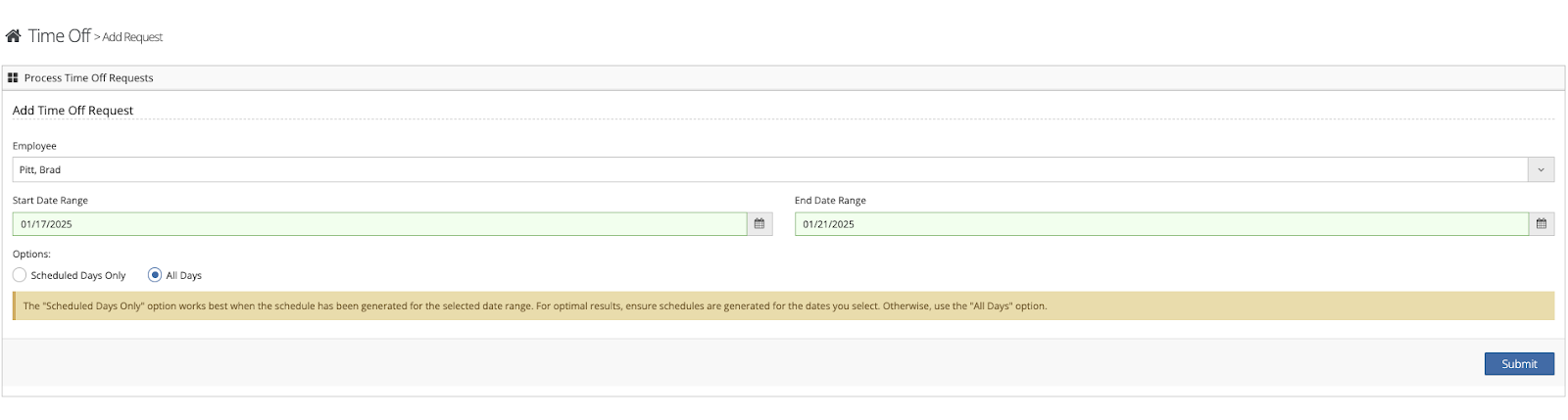 **If selecting ‘Scheduled Days Only’ and you are not generated for the time span selected, time off will not be applied. The best practice is to select ‘All Days’ if the schedule is not generated for the selected time span.**